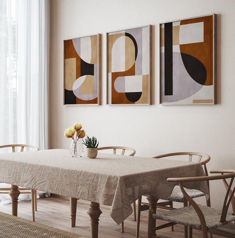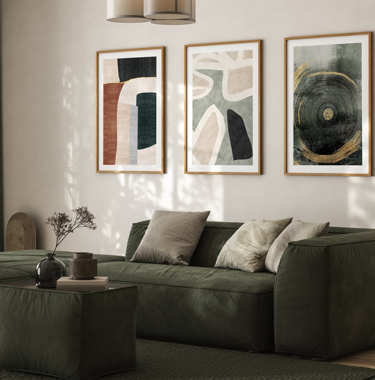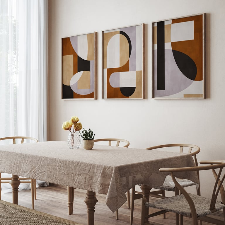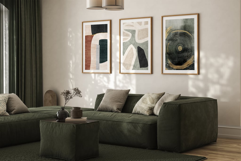 Trys vienas kitą papildantys printai – subtilus akcentas, suteikiantis sienoms gylio, ritmo ir išbaigtumo.